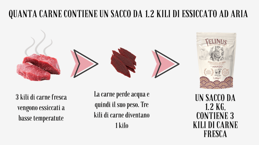 Dans un sac de 1,2 kg de séché à l’air, tu trouves 1 kg de viande séchée, obtenue en retirant uniquement l’eau de la viande fraîche.